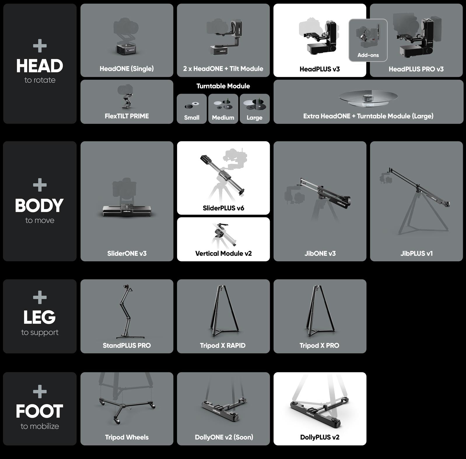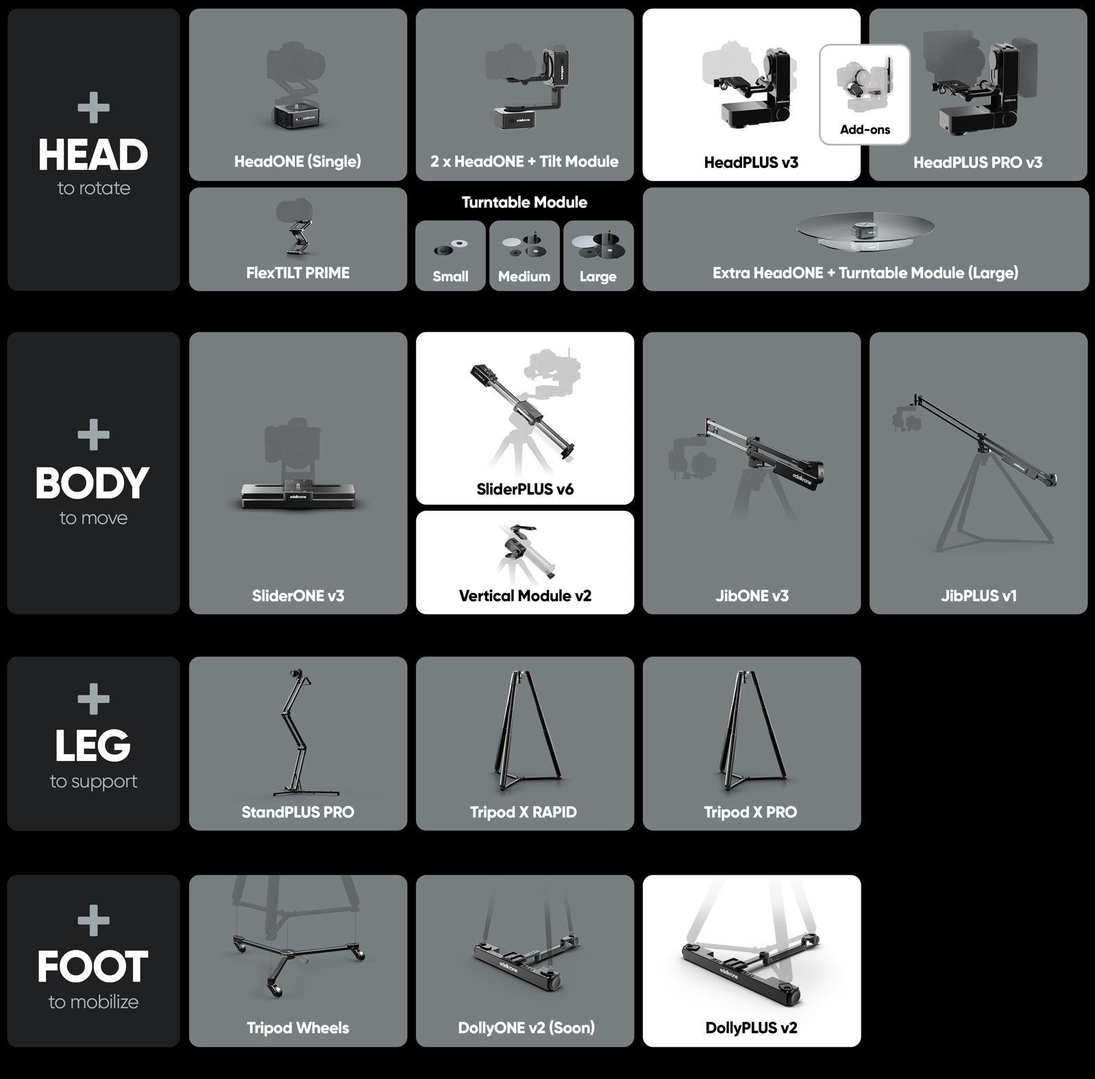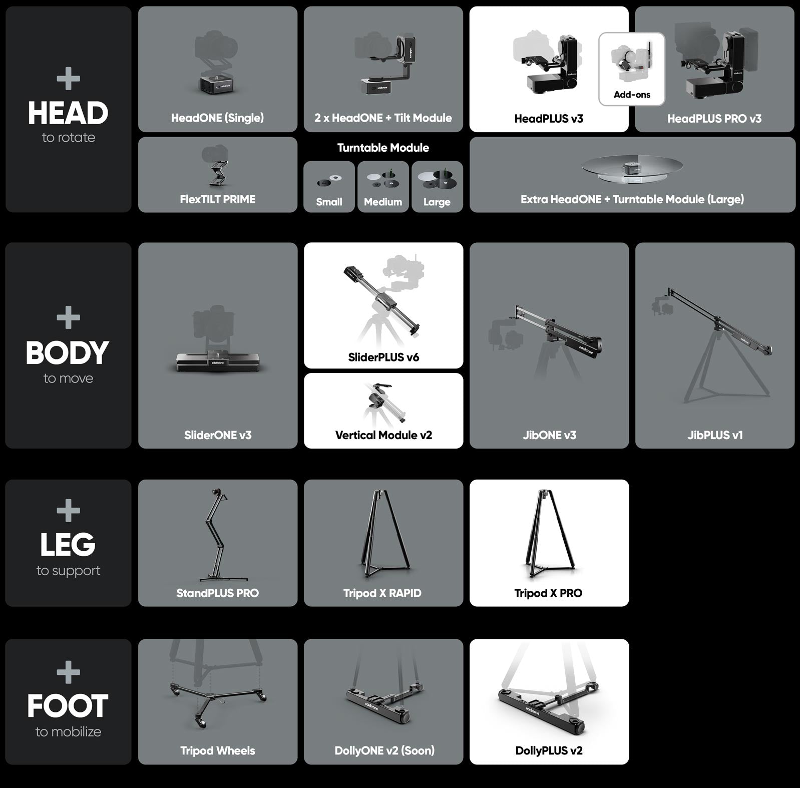 This bundle uses DollyPLUS v2 as the base, SliderPLUS v6 with Vertical Module v2 as the body, and HeadPLUS v3 as the head, creating a fully integrated system with complete mobility and flexibility for any kind of motion control setup.